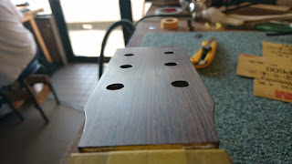 今日の午前中は大掃除。 スライド丸のこや製材機が置いてある部屋をキレイにしました♪ ここは「外」と呼ばれていて、木の粉や削りカスが多く出る時に使われている部屋。 これでもか!というほどの木屑をキレイに掃き掃除しました。 掃除が終わってからは昨日発見した穴にシーラーを吹き付けました。 その面以外に塗料が付かないようマスキングをして、いつもより一回り小さいものを使います。 乾燥時間を挟んだ後で磨いたものがこちら。 だいぶ埋まってますがもう一度吹付け必要っぽいです。 この磨き作業中にそれは起こりました。 何と磨き中に作業台からギターがずり落ちそうになり、空中でキャッチ! 落下は防げましたが作業台の角に擦れてキズが (´・ω・`) ヒールプレートとバック板に… バック板左側にも… 見立てでは木まで達してはいないようで埋めれば消えるとのこと。 ということで明日はまたウッドシーラー塗りに戻ります。 落下が避けられたことは不幸中の幸いでした (^_^;)